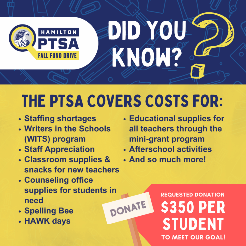 Do you value your children’s experience at Hamilton, and the ability to provide the basic resources, tools and opportunities for our students and staff? Then please make a year-end donation to the Hamilton PTSA here! Whatever you can give – big or small, it will help create a stronger support system for all of our kids. Without full participation from the Hamilton community, we will fall short on being able to provide for this year’s athletic programs, teacher trainings, HAWK day experiences, and mini grants for teachers to be able to purchase materials that they need for their specific classrooms. Make your tax-deductible donation today! Thanks for looking out for your HIMS community. Go Hawks!